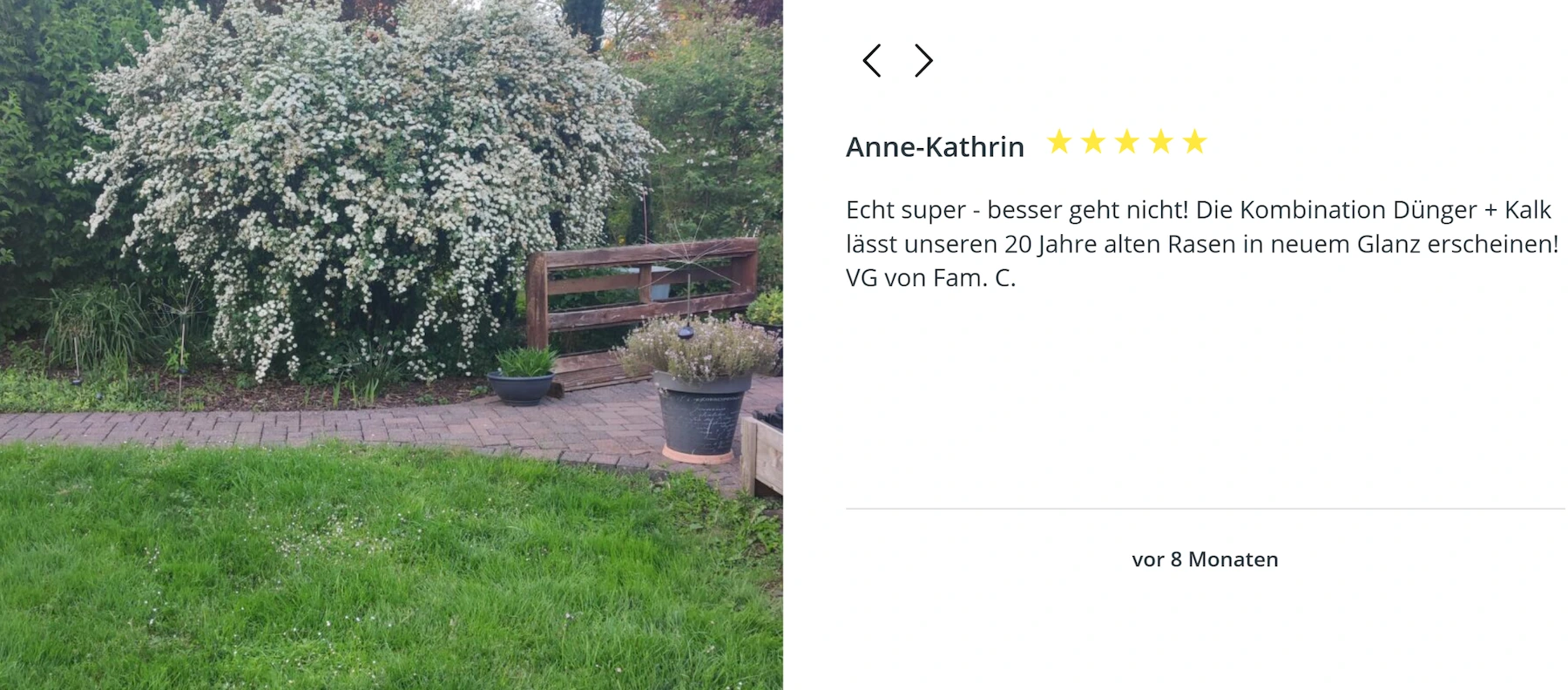 Am nächsten Tag düngte ich meinen Rasen. Hier sehe ich den größten Vorteil von Turbogrün im Vergleich zu herkömmlichen Kalk. Bei anderen Produkten muss mehrere Wochen gewartet werden, bis Dünger aufgetragen werden kann. Der Rasenkalk von Turbogrün ist so entwickelt, dass er die Düngung sogar effektiver macht: Die Rasenwurzeln können deutlich mehr Nährstoffe aufnehmen.